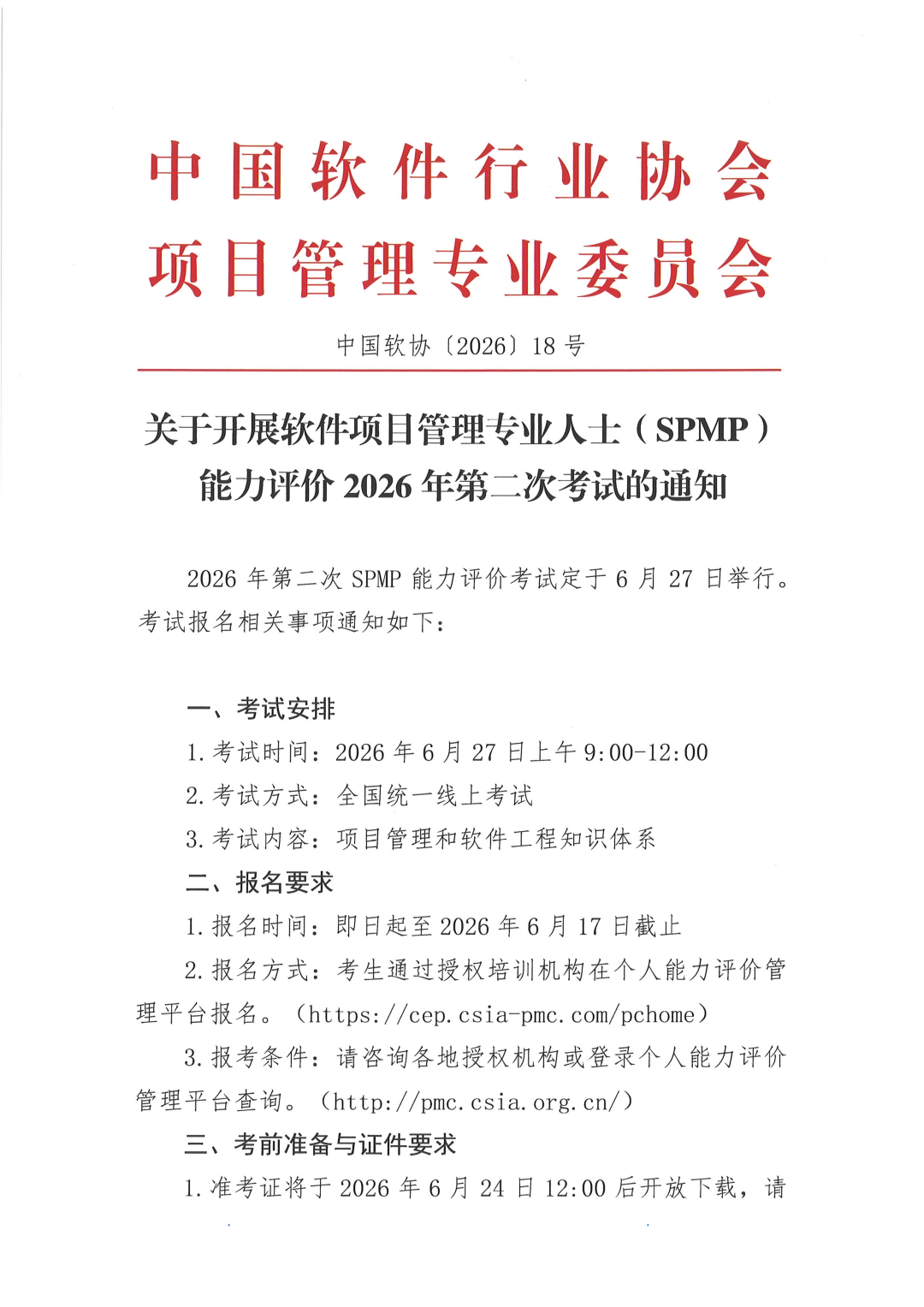 关于开展软件项目管理专业人士(SPMP)能力评价2026年第二次考试的通知
