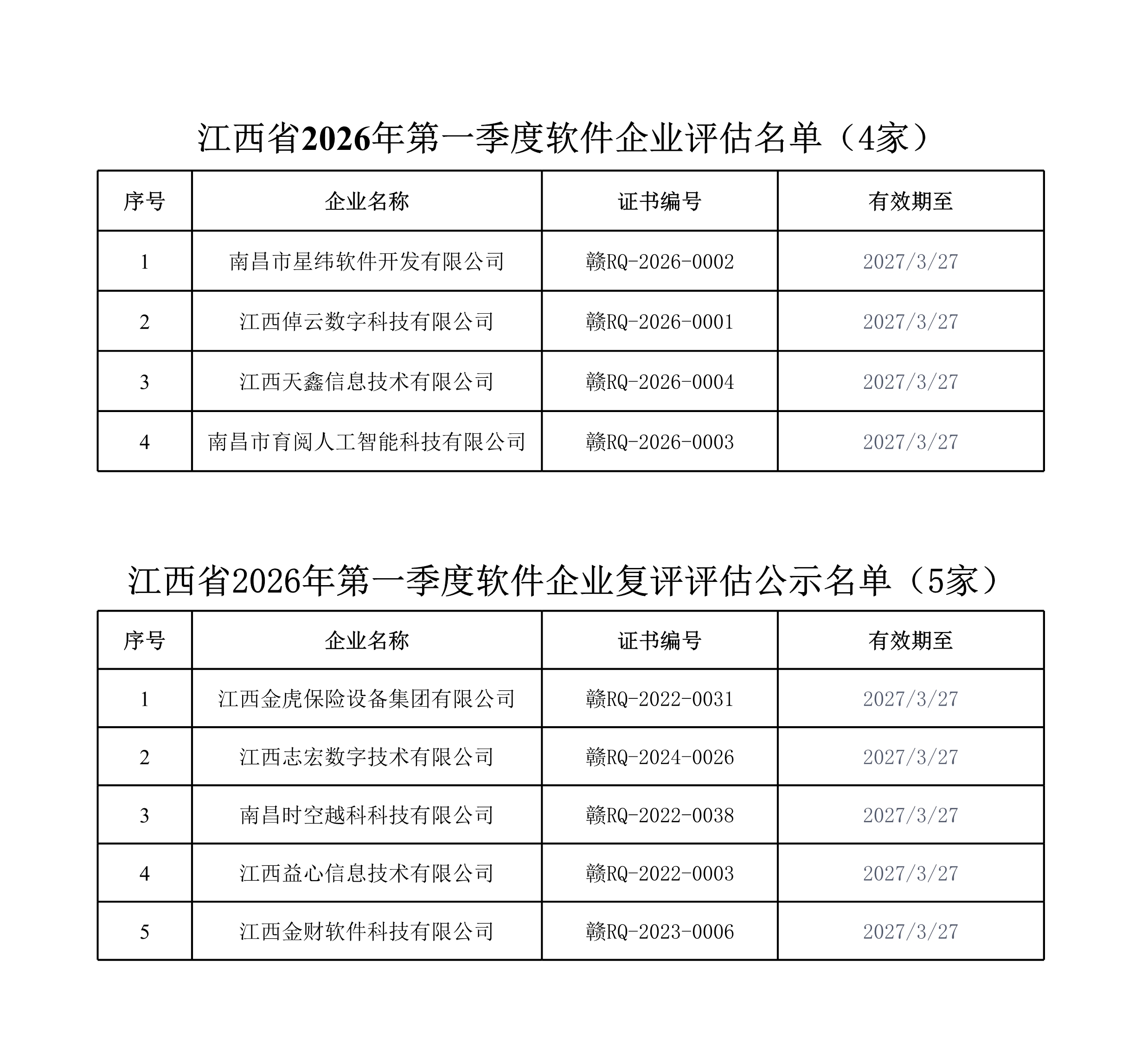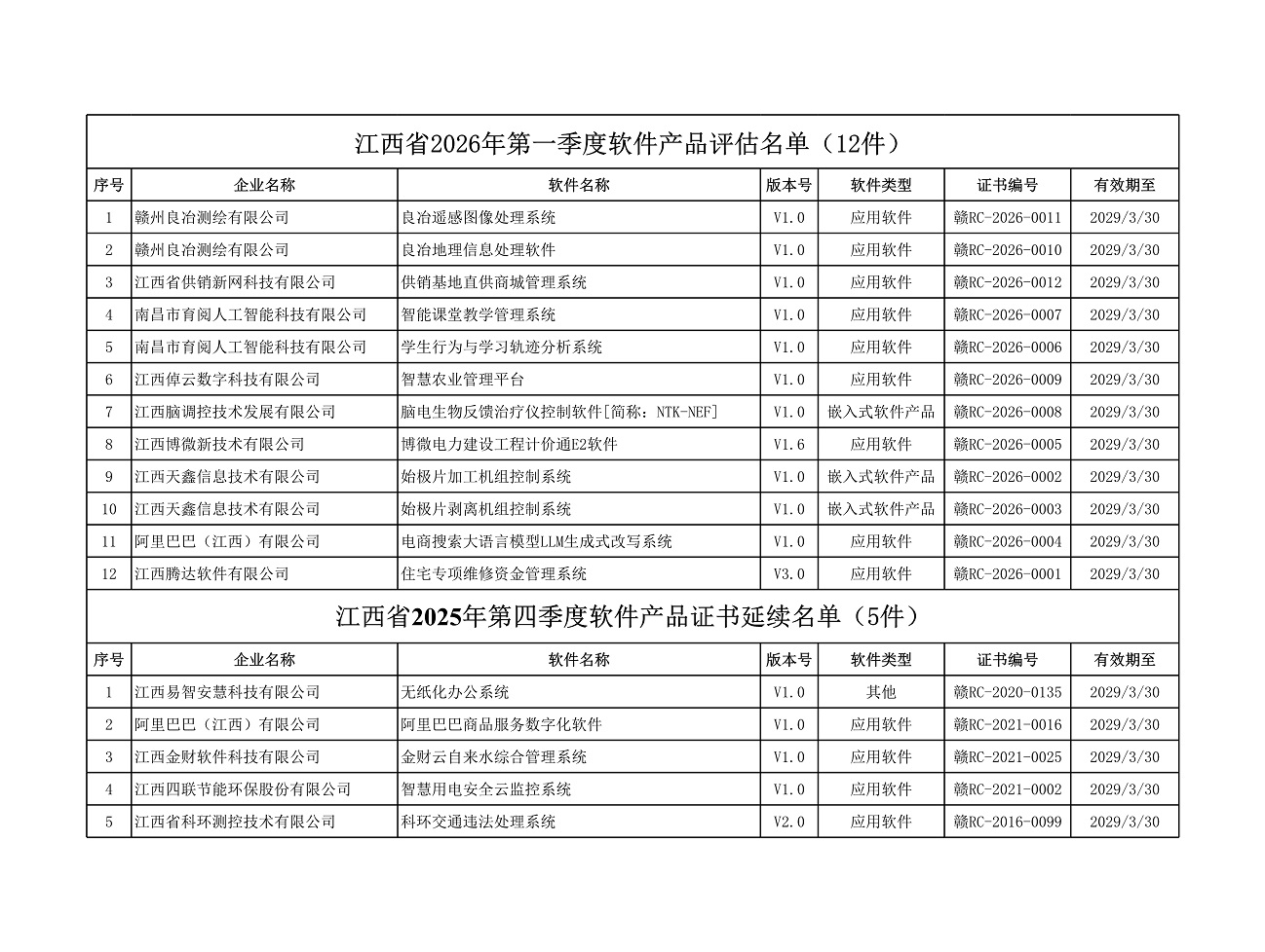 根据《软件企业评估规范》(T/SIA002-2019)、《软件产品评估规范》(T/SIA003-2019),江西省软件行业协会组织专家对申请评估的软件企业和软件产品申报材料进行了评估。经评估,9家企业符合《软件企业评估规范》,以及阿里巴巴商品服务数字化软件V1.0 等17件软件产品符合《软件产品评估规范》。现将评估结果进行公示,公示期为2026年3月27日-2026年4月3日,如对公示名单有异议,请在公示期内以书面意见反馈给江西省软件行业协会,为了便于核实,请提供意见人的真实名称及有效联系方式。